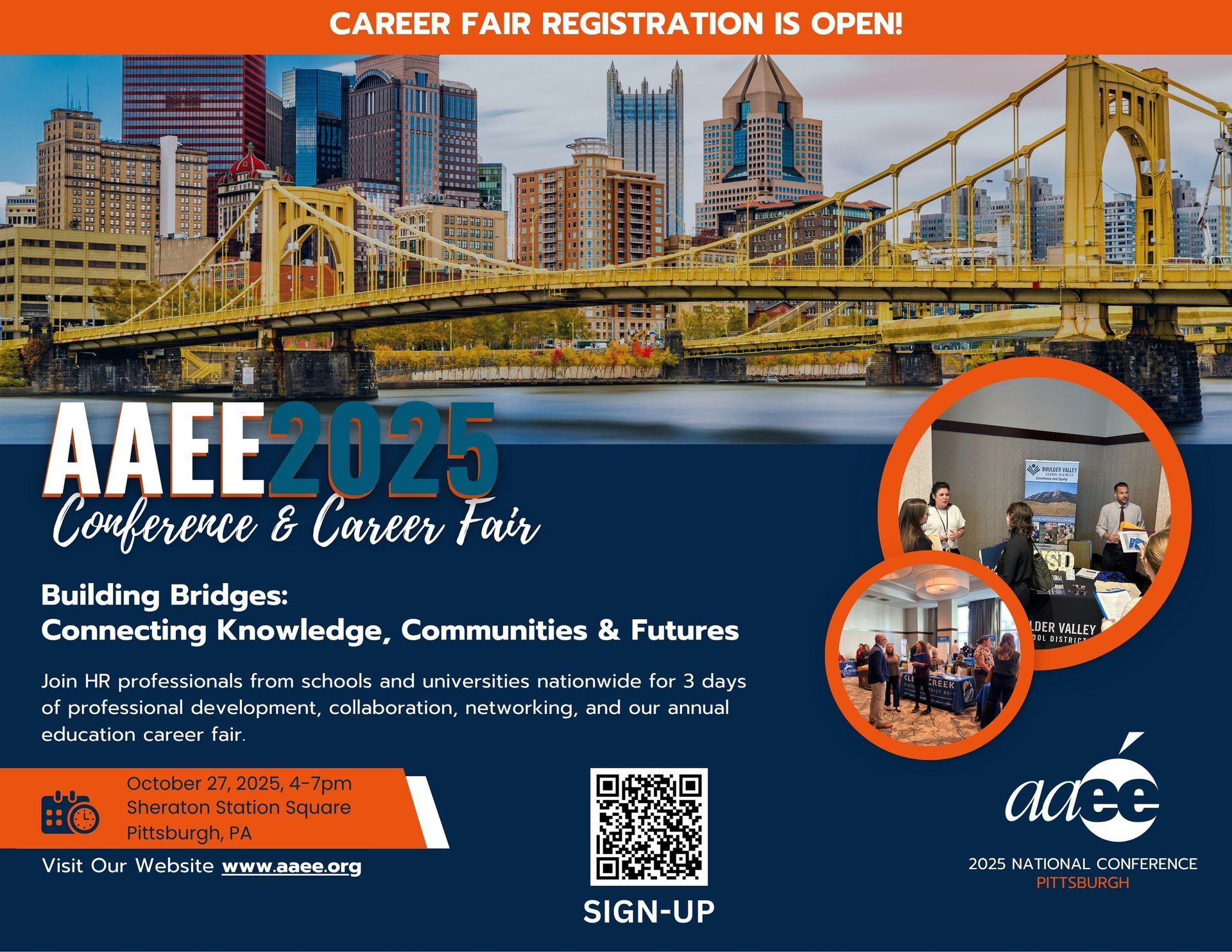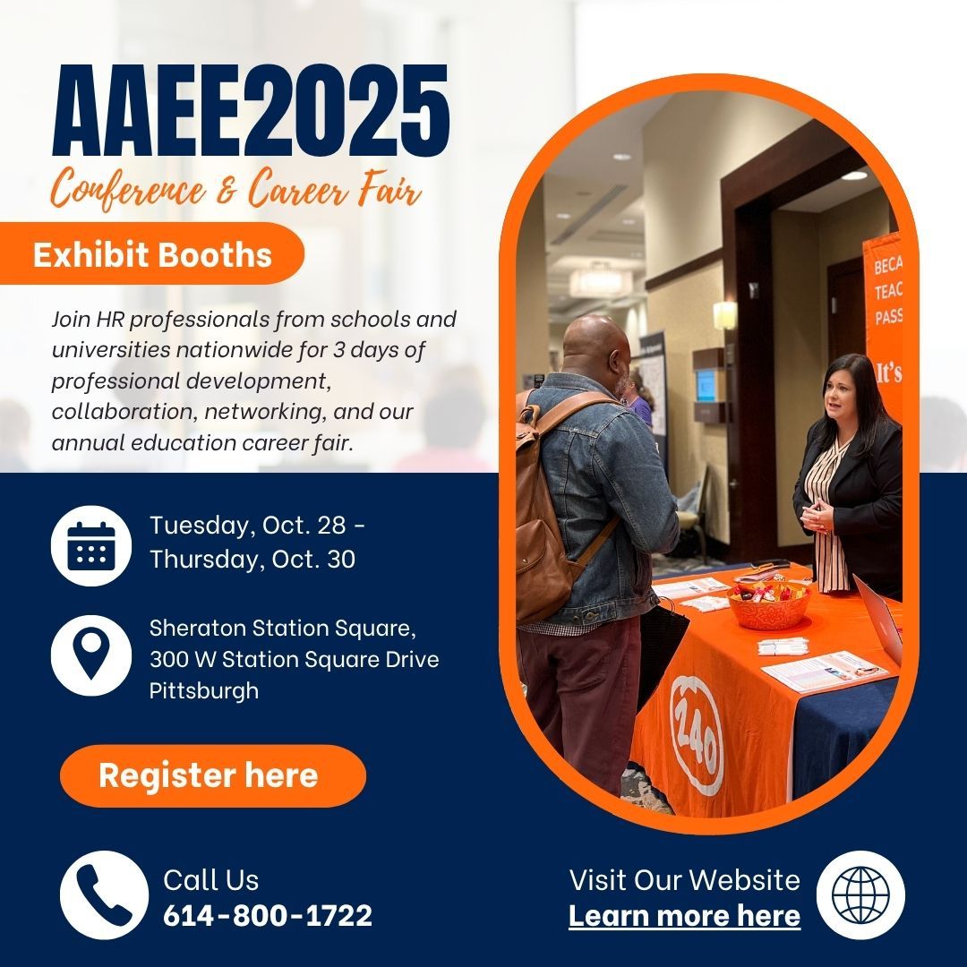 The AAEE Annual Conference, hosted in Pittsburgh this year, is the premier event for recruiting, retention and human resources and career center professionals in secondary and higher education. We feature three (3) days of exhibiting along with breaks and networking to help you expand your connections with attendees.